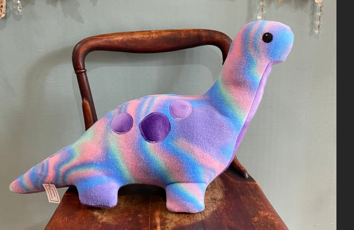 Granny Flounders creates unique dinosaurs from recycled fabric scraps. These colorful and magical creatures are sure to bring whimsy to your world. Each one is one-of-a-kind, making them even more special. Reach out to us to see our current colors and designs, or let it be a surprise when it arrives! Trust us, it'll be a delightful surprise either way.