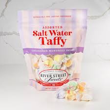 Locally made by Savannah's own, River Street Sweets. Indulge in our delectable Taffy Pouch, a 14oz bag filled with an assortment of flavors. With its resealable design, your taffy will stay fresh and delicious for days. Satisfy your sweet tooth and enjoy the convenience of a resealable bag.