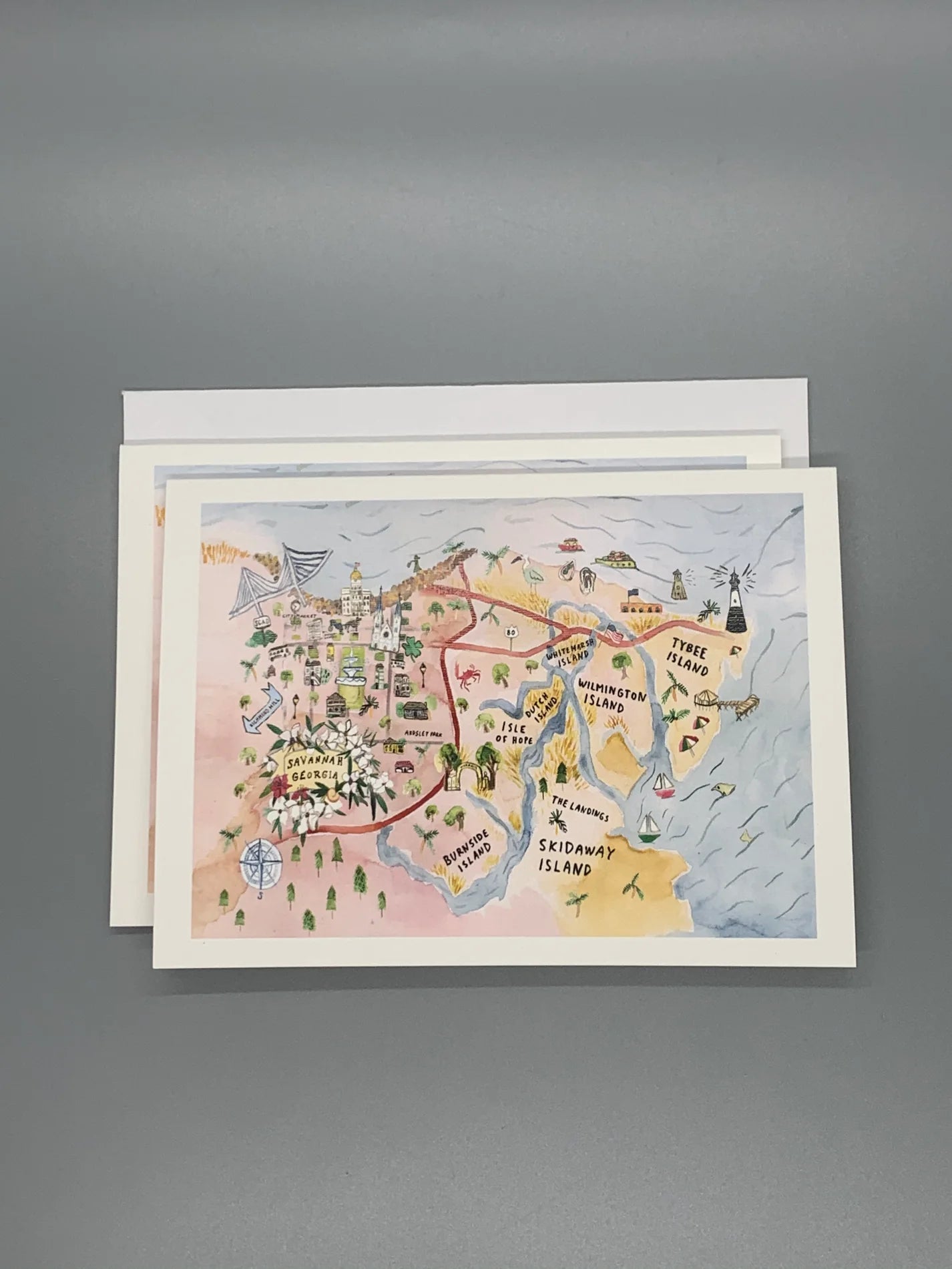 The art of personal notes is not of the past. Share your thoughts with one of our beautiful watercolor map notecards. Each notecard is 4x5, blank inside, and includes a white envelope.