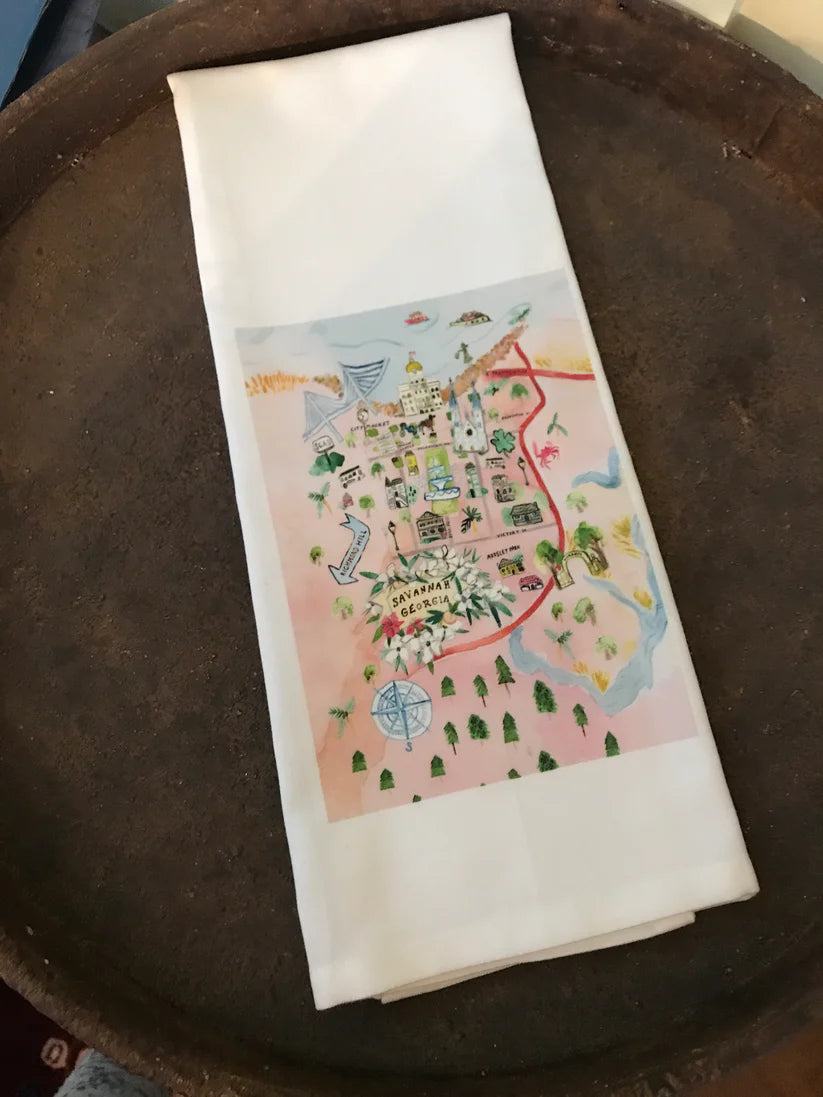 These whimsical tea towels, showcasing two distinctive maps of Savannah, are a must-have addition to any kitchen. Measuring 17”x30” and made from absorbent, durable 100% cotton, they even feature a handy corner loop for easy storage and drying. Printed directly onto the cloth using the latest technology, these towels are made by a veteran-owned company. For optimal results, use non-chlorine bleach and lay flat or hang dry.