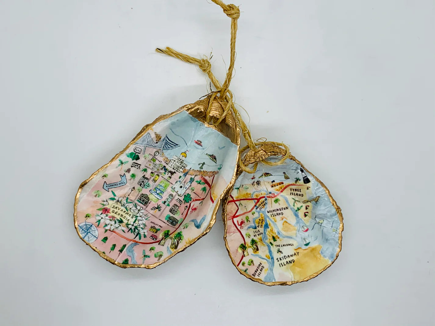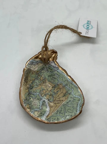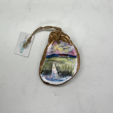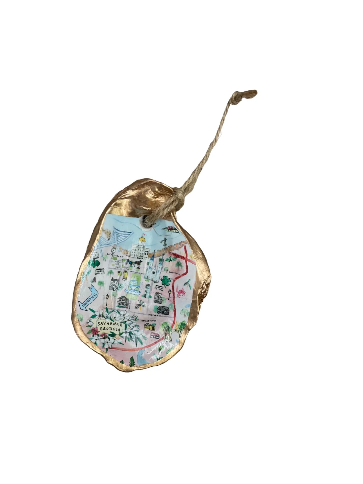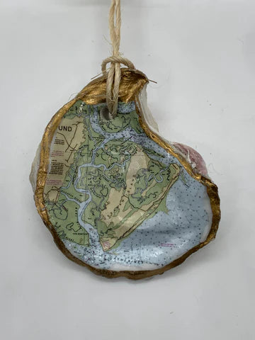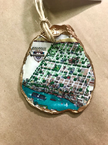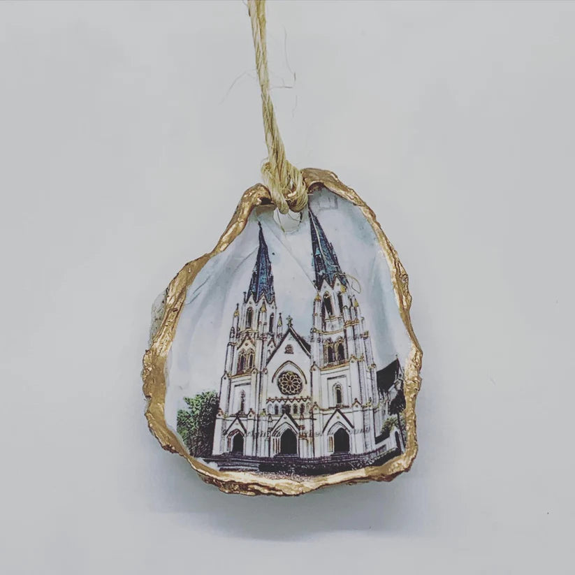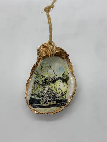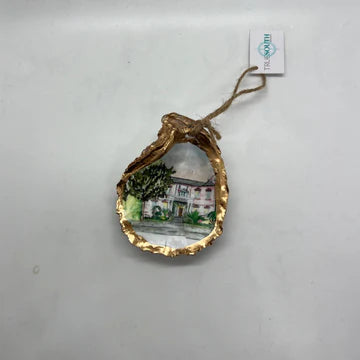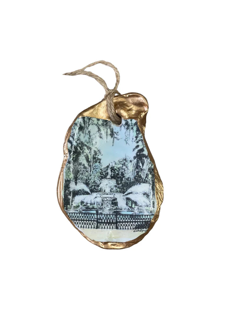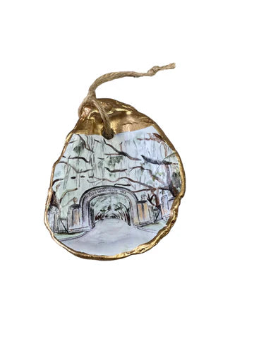 Relive your trip to Savannah with our one-of-a-kind oyster ornaments. Featuring unique Savannah scenes, these ornaments are a must-have for any quirky collector. Each ornament is accented with a gold leaf edge and hung with jute twine, adding a touch of whimsy and nostalgia to your Christmas tree. Please note that each shell is unique in size and shape, making every ornament one-of-a-kind. *The ornament you receive will be similar but not identical to the one shown.*