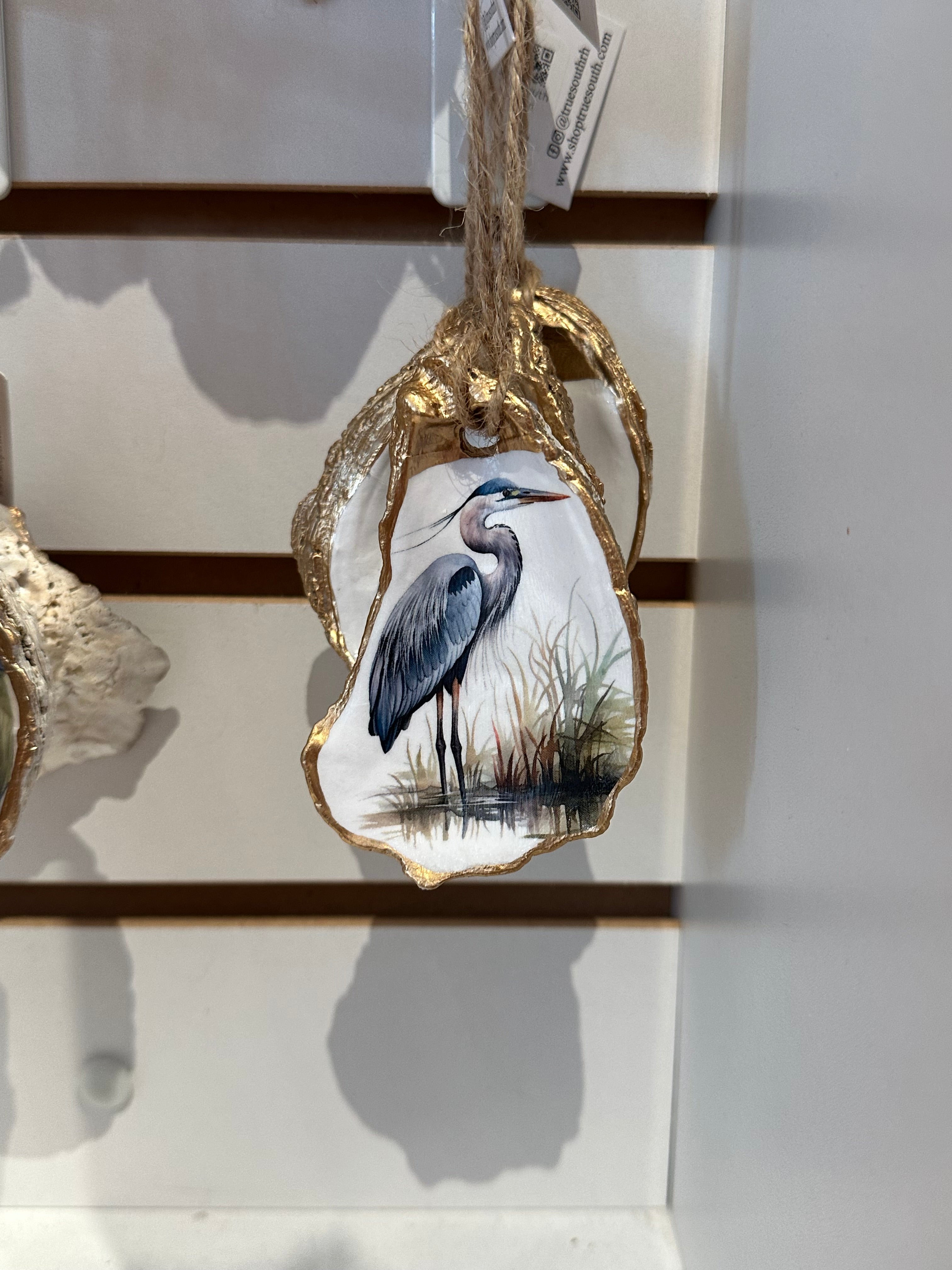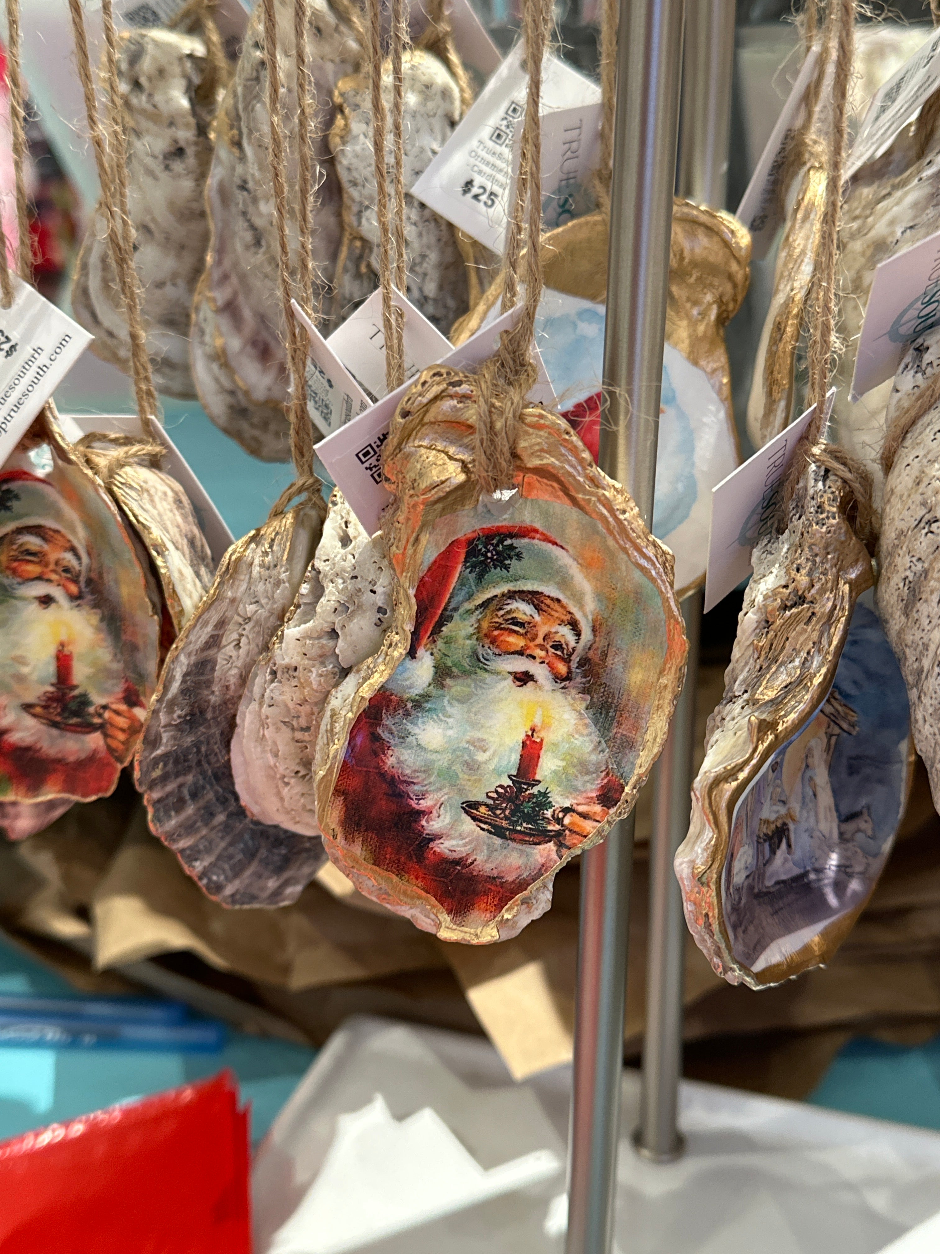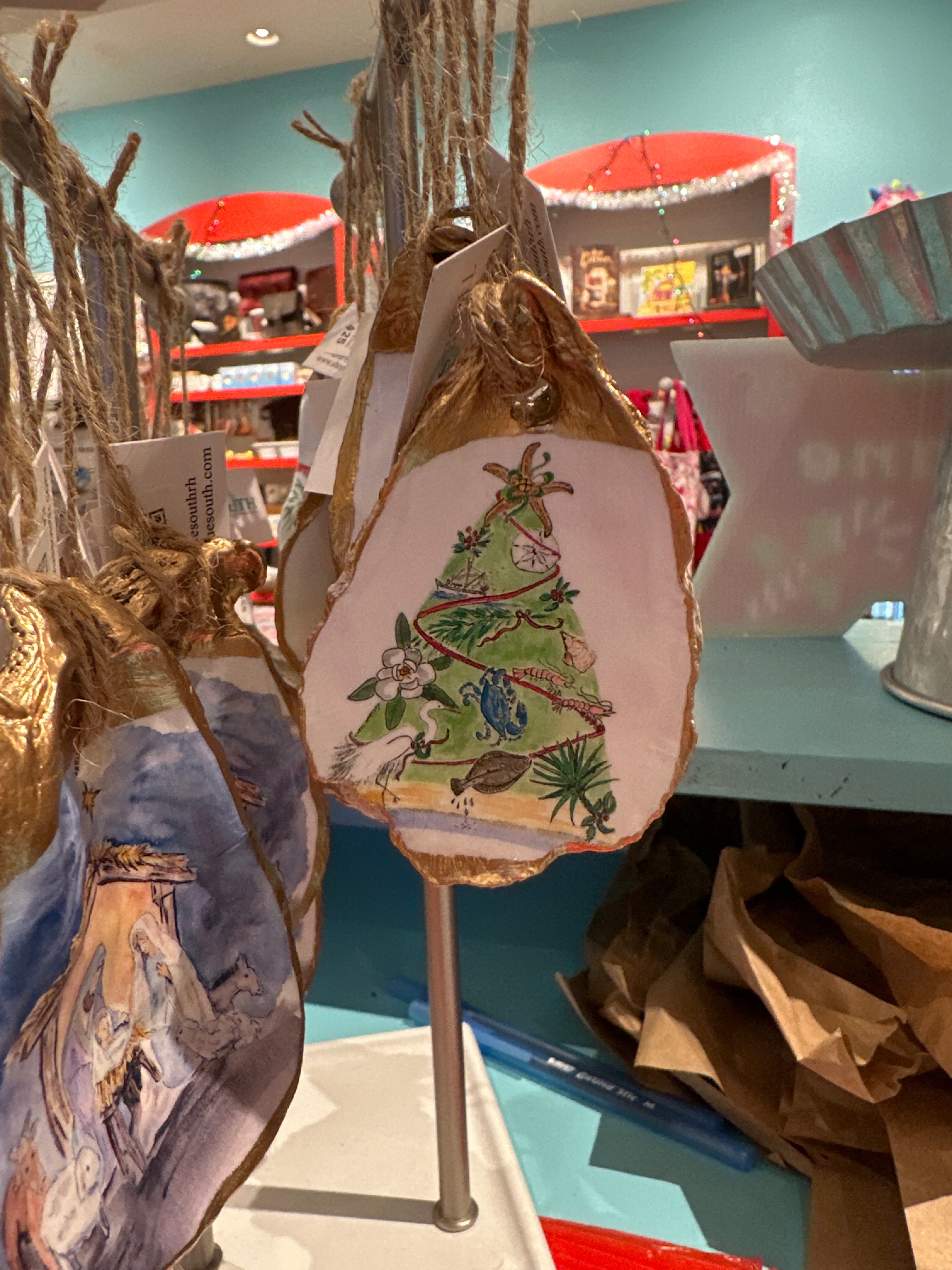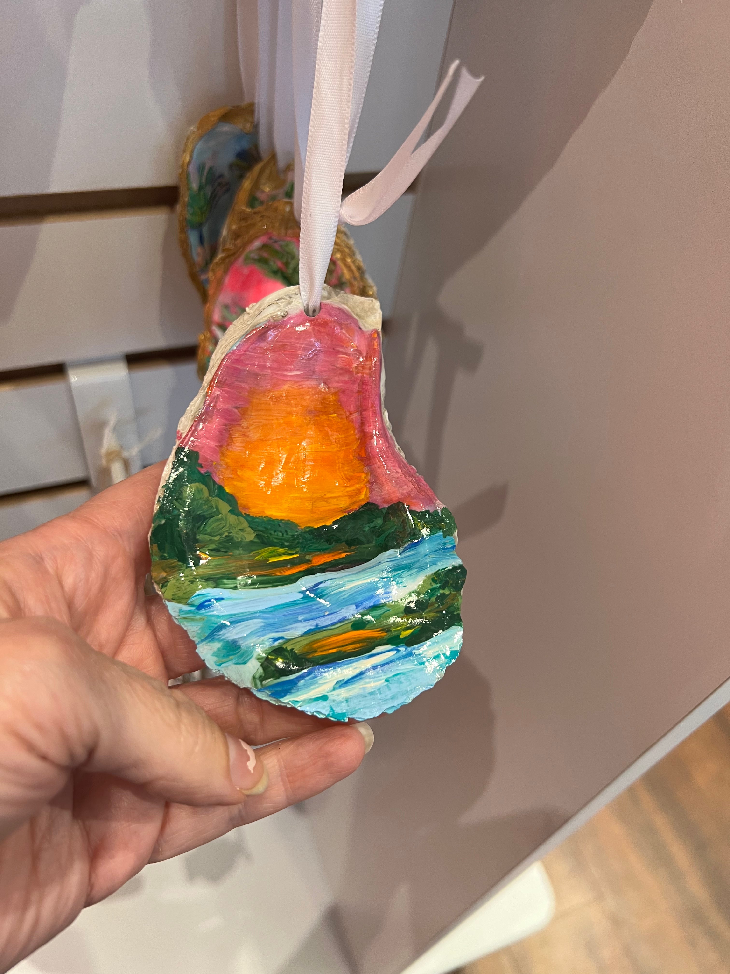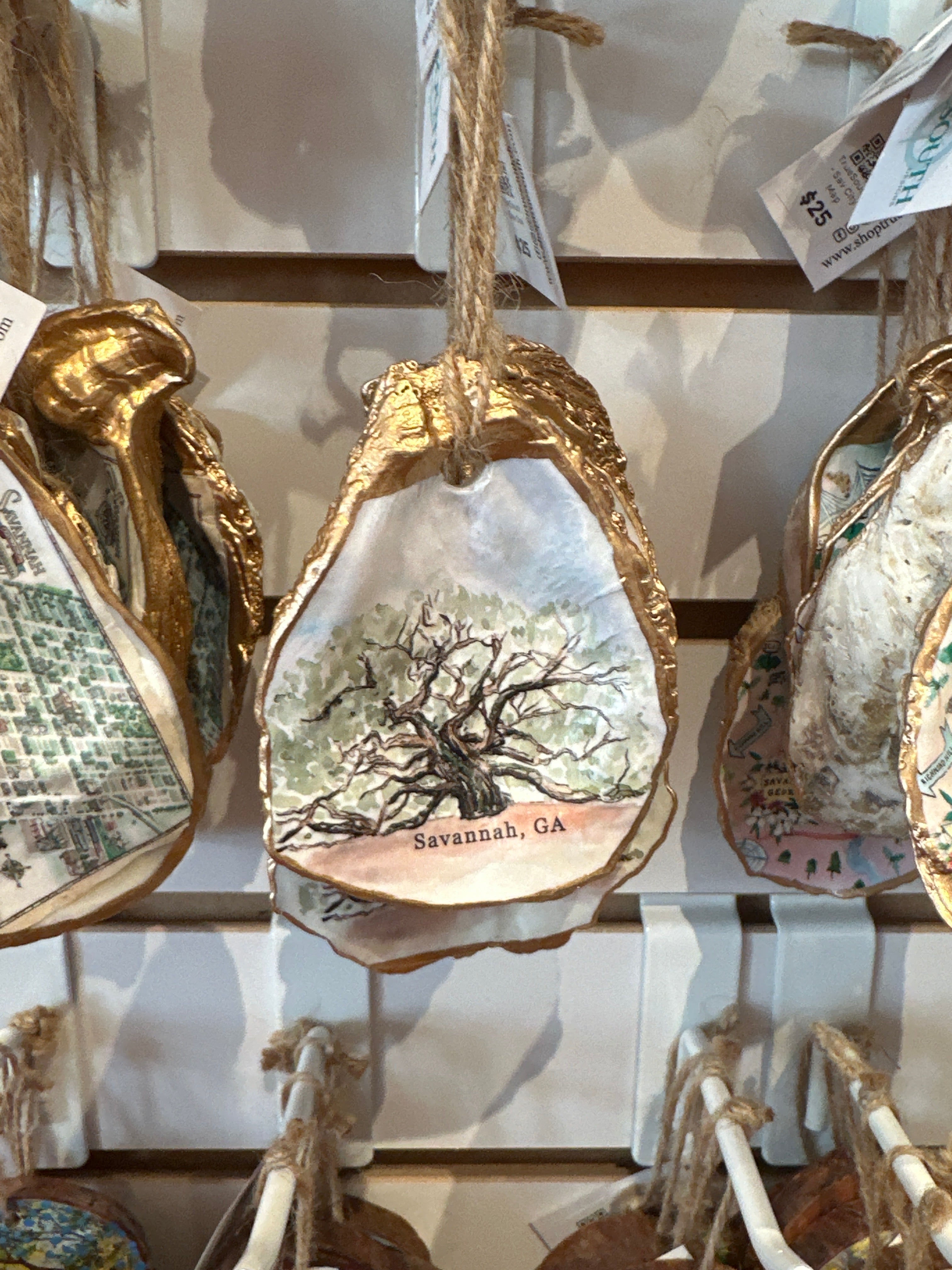 Relive your trip to Savannah with our one-of-a-kind oyster ornaments. Featuring unique Savannah scenes, these ornaments are a must-have for any quirky collector. Each ornament is accented with a gold leaf edge and hung with jute twine, adding a touch of whimsy and nostalgia to your Christmas tree. Please note that each shell is unique in size and shape, making every ornament one-of-a-kind. *The ornament you receive will be similar but not identical to the one shown.*