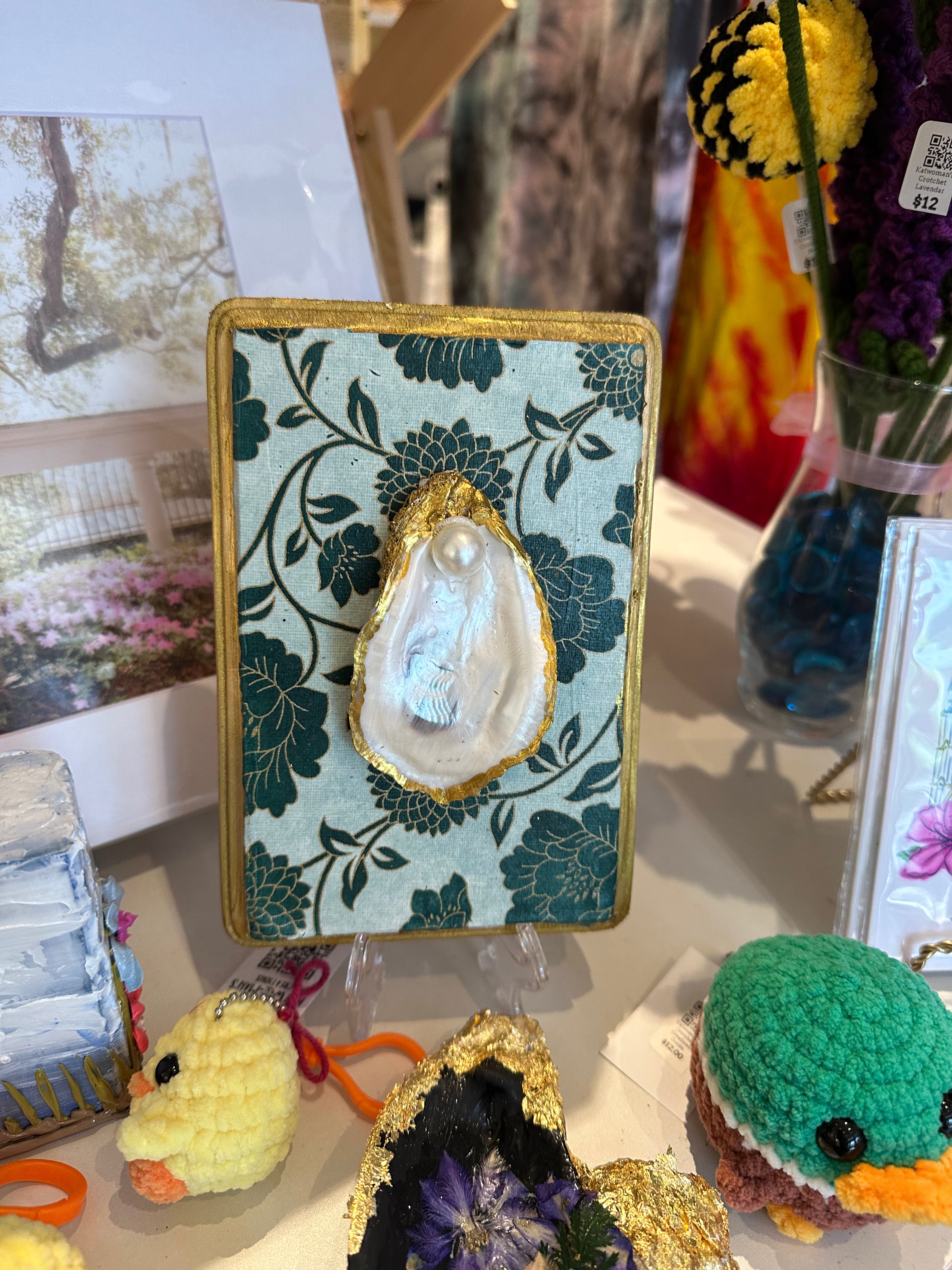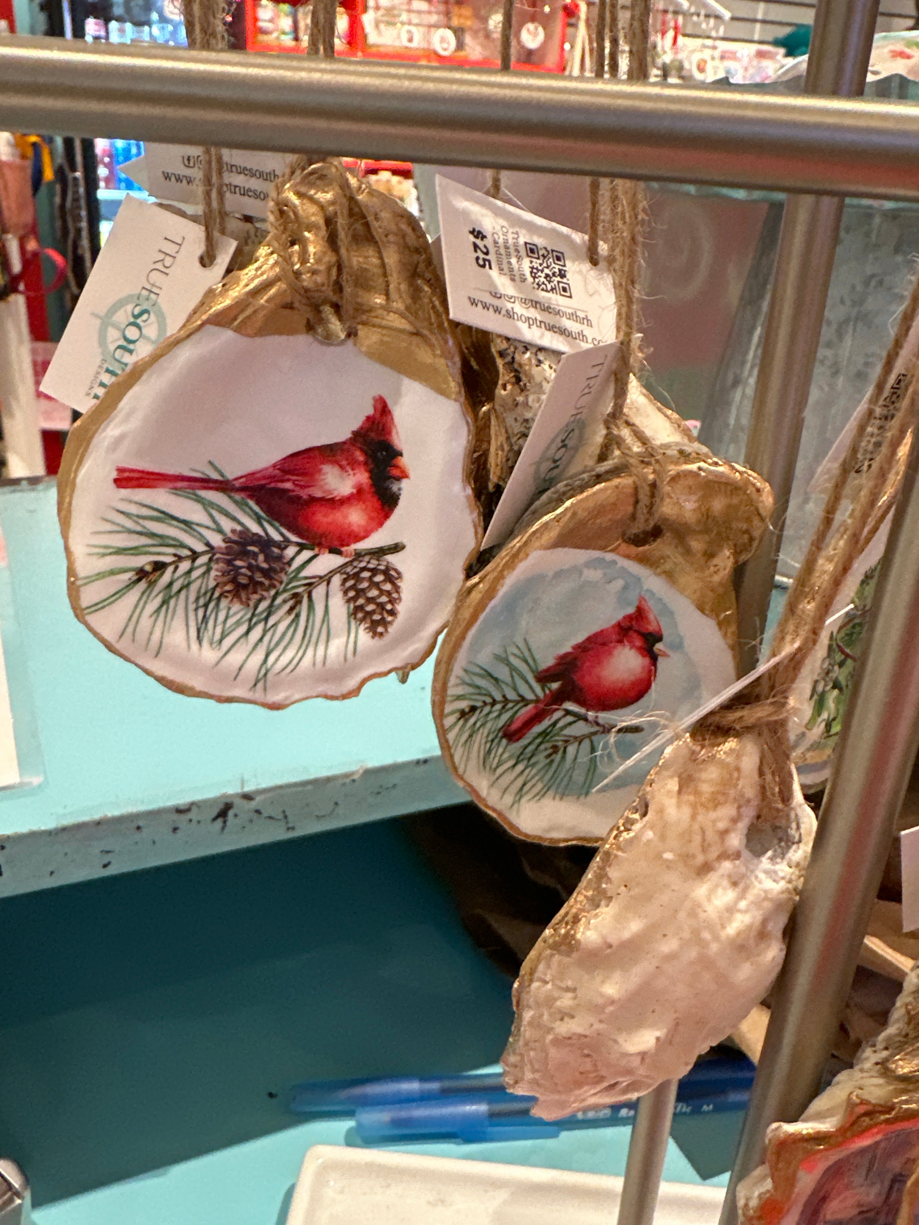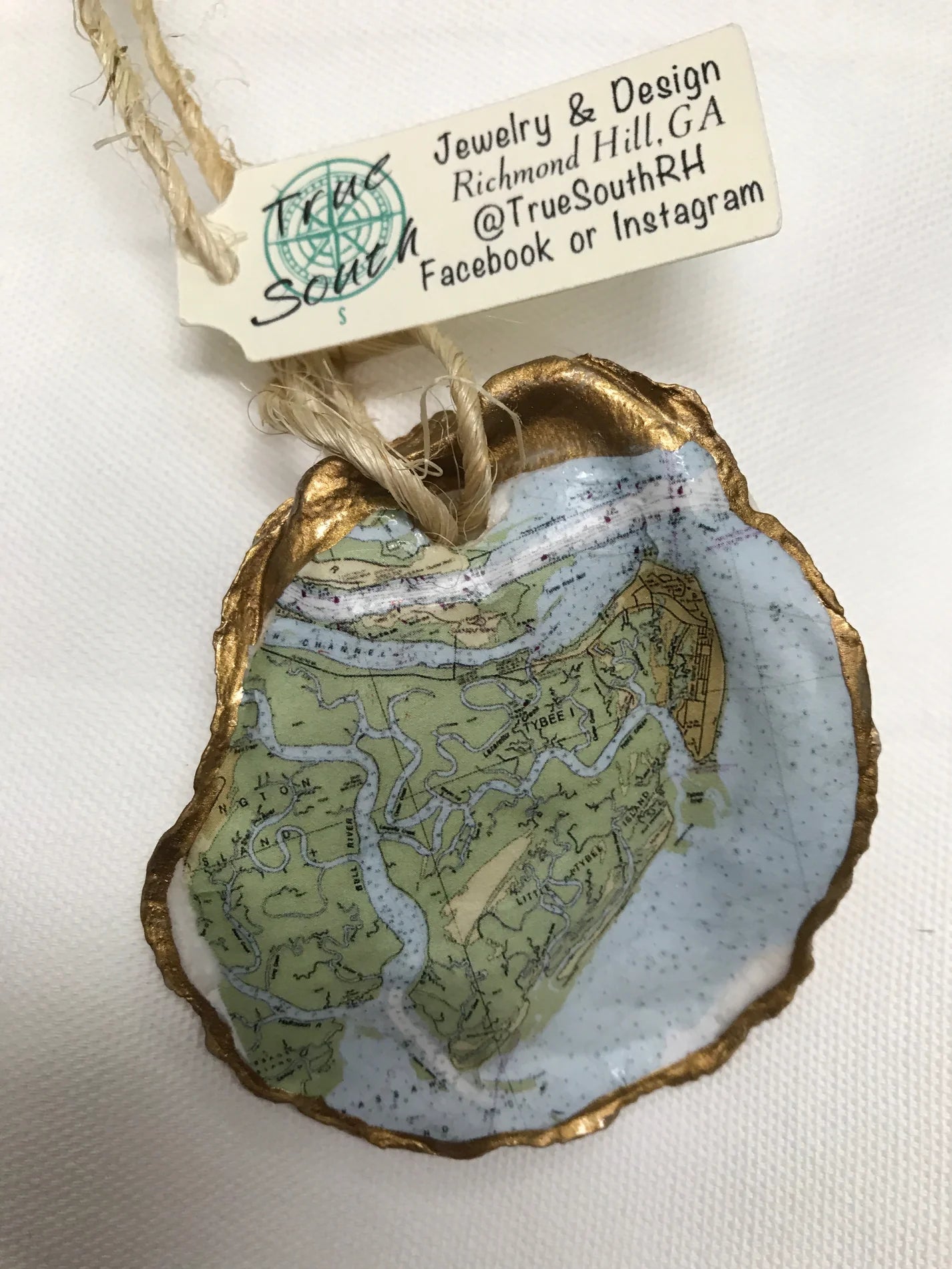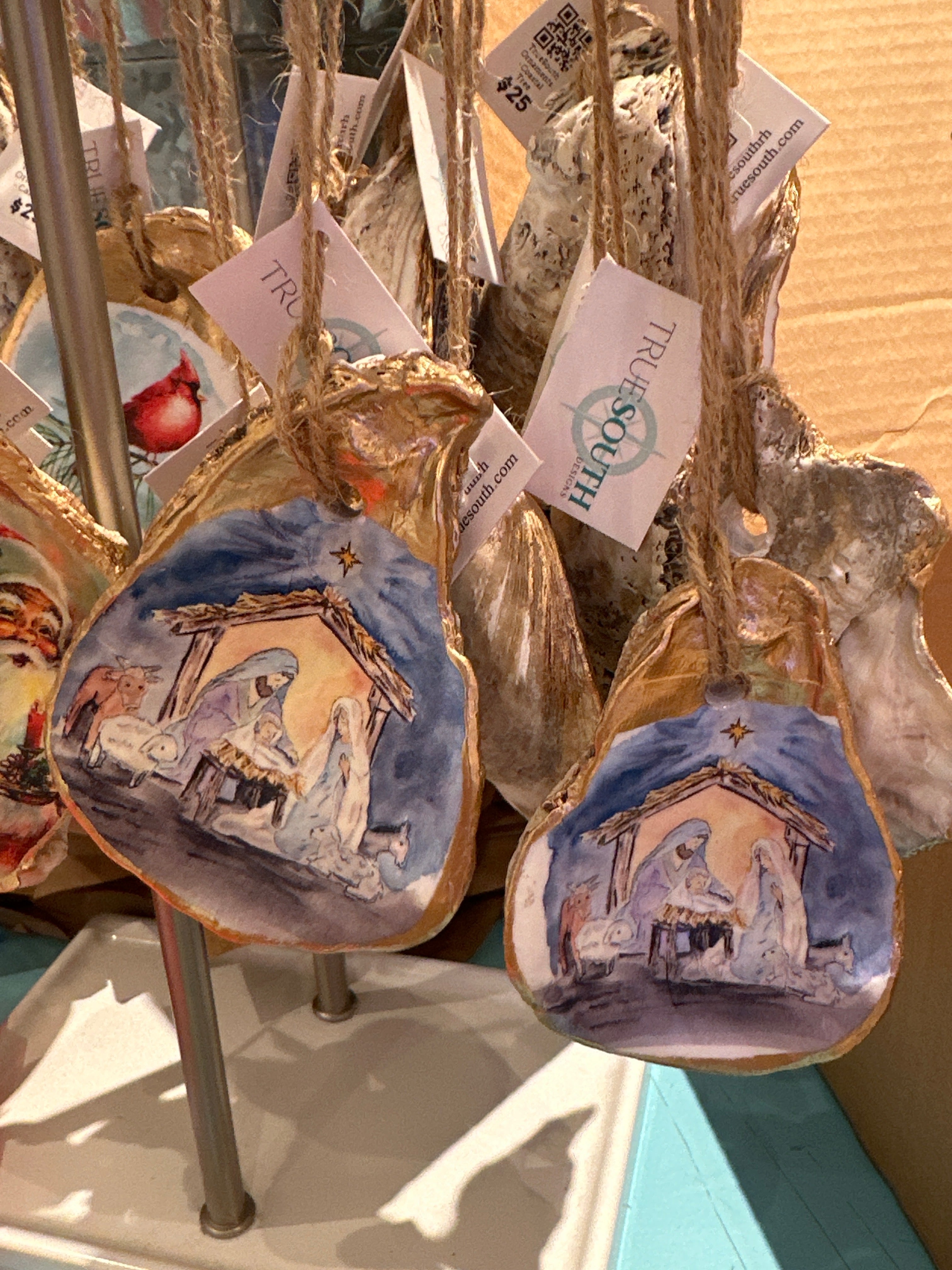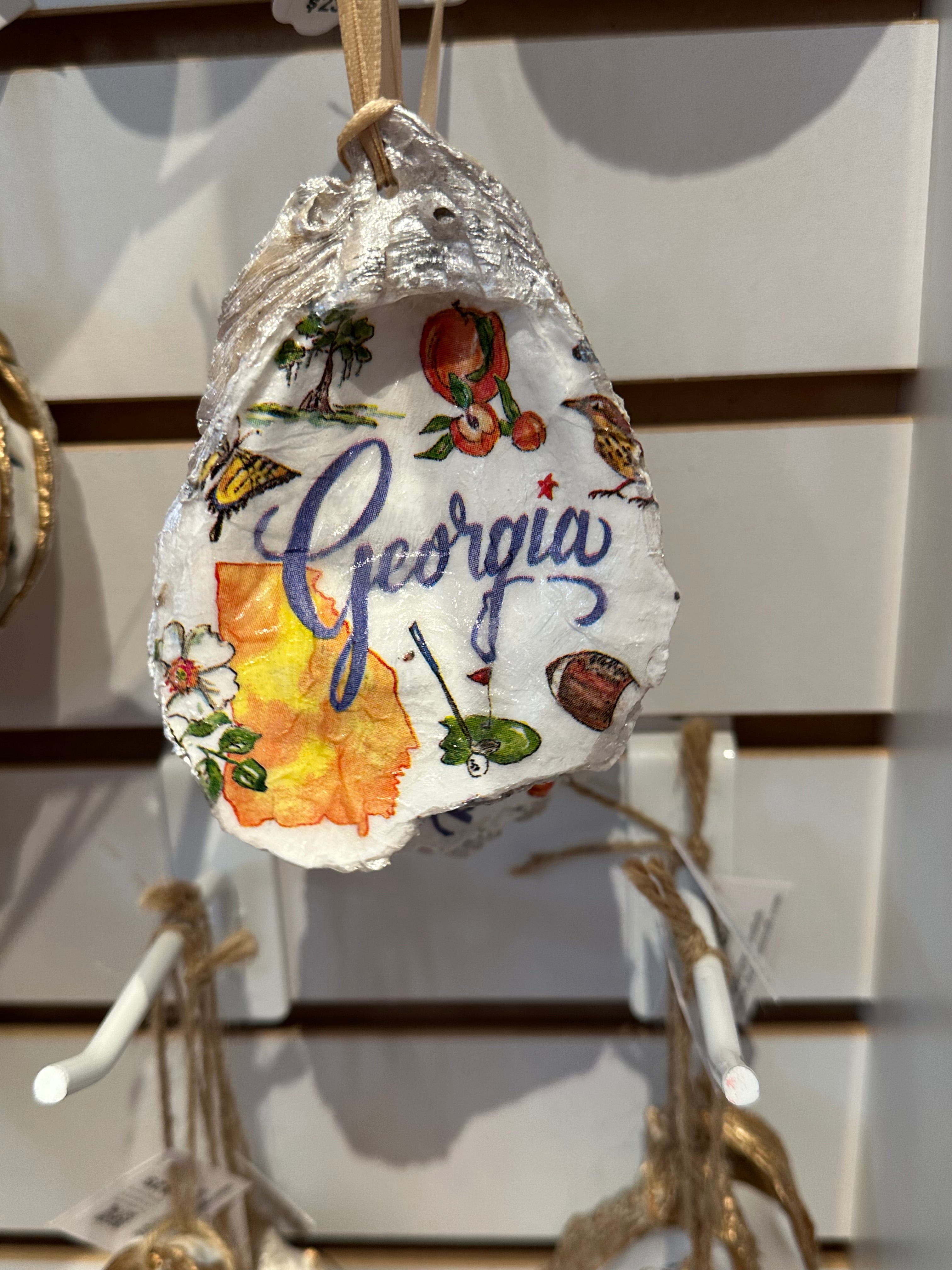 Relive your trip to Savannah with our one-of-a-kind oyster ornaments. Featuring unique Savannah scenes, these ornaments are a must-have for any quirky collector. Each ornament is accented with a gold leaf edge and hung with jute twine, adding a touch of whimsy and nostalgia to your Christmas tree. Please note that each shell is unique in size and shape, making every ornament one-of-a-kind. *The ornament you receive will be similar but not identical to the one shown.*